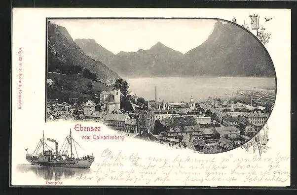 AK Ebensee, Dampfer mit Blick auf die Ortschaft vom Calvarienberg