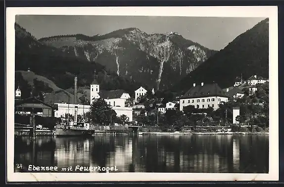 AK Ebensee, Ortsansicht vom Wasser aus, mit Feuerkogel