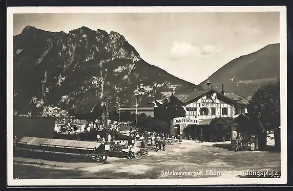 AK Ebensee, Partie am Landungsplatz, mit Restauration zum Dampfschiff