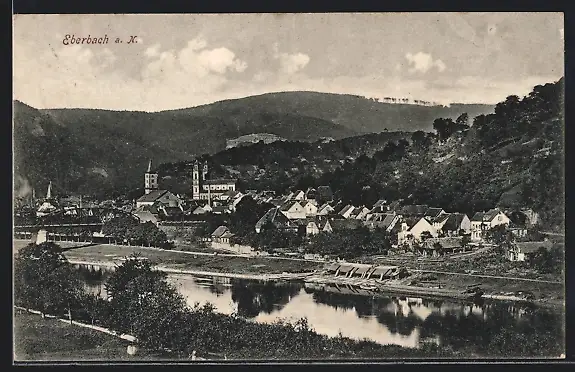 AK Eberbach a. N., Ortsansicht mit Neckarbrücke