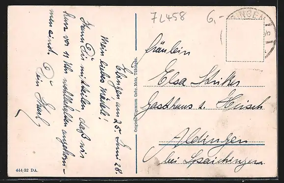 Personenbezogene Daten auf der Rückseite der Karte wurden durch blauen Textmarker unkenntlich gemacht. Die blauen Stellen sind auf die Vorderseite durchgeweicht und wirken sich negativ auf das Postkartenfoto aus