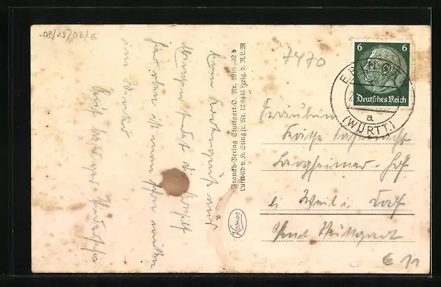 Personenbezogene Daten auf der Rückseite der Karte wurden durch blauen Textmarker unkenntlich gemacht. Die blauen Stellen sind auf die Vorderseite durchgeweicht und wirken sich negativ auf das Postkartenfoto aus