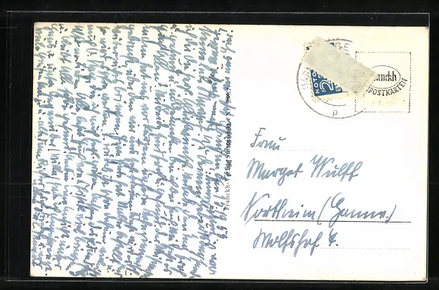 Personenbezogene Daten auf der Rückseite der Karte wurden durch blauen Textmarker unkenntlich gemacht. Die blauen Stellen sind auf die Vorderseite durchgeweicht und wirken sich negativ auf das Postkartenfoto aus