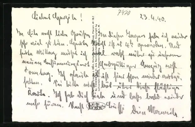 Personenbezogene Daten auf der Rückseite der Karte wurden durch blauen Textmarker unkenntlich gemacht. Die blauen Stellen sind auf die Vorderseite durchgeweicht und wirken sich negativ auf das Postkartenfoto aus
