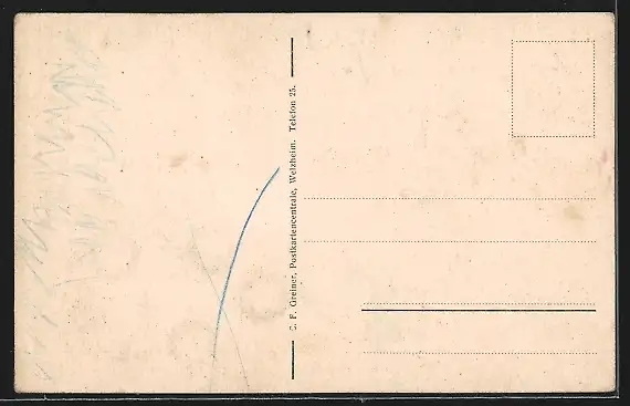 Personenbezogene Daten auf der Rückseite der Karte wurden durch blauen Textmarker unkenntlich gemacht. Die blauen Stellen sind auf die Vorderseite durchgeweicht und wirken sich negativ auf das Postkartenfoto aus