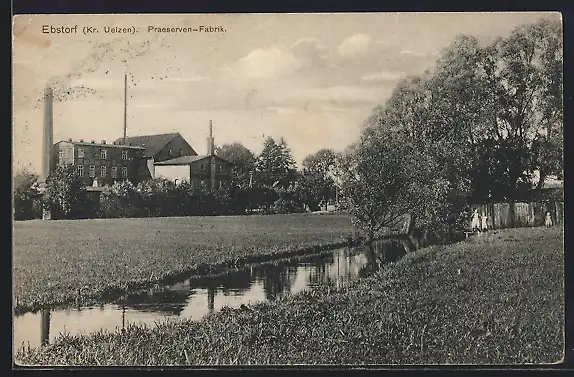 AK Ebstorf /Uelzen, Uferpartie nahe der Praeserven-Fabrik