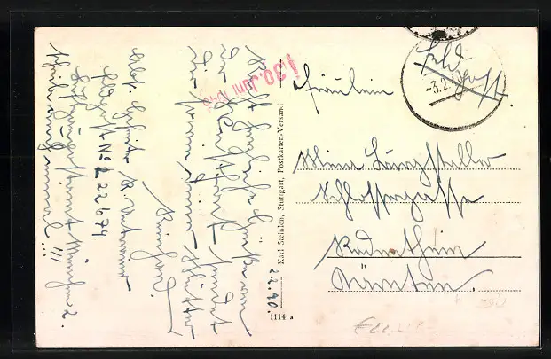 Personenbezogene Daten auf der Rückseite der Karte wurden durch blauen Textmarker unkenntlich gemacht. Die blauen Stellen sind auf die Vorderseite durchgeweicht und wirken sich negativ auf das Postkartenfoto aus