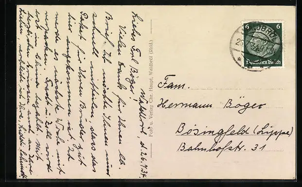 gelaufen 1934, Eckknick oben links und unten rechts, guter Zustand