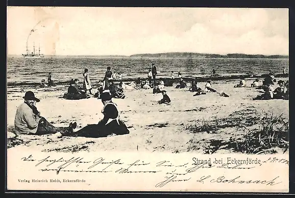 AK Eckernförde, Strand, Im Hintergrund Segelschiff