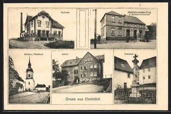 AK Eckolstädt, Molkerei, Materialwarenhandlung Friedrich, Kirche, Denkmal, Schule