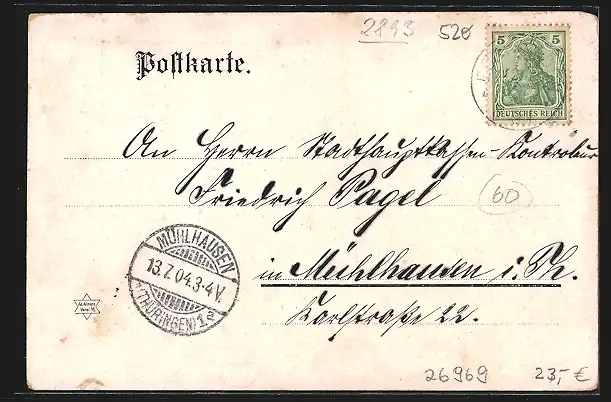 gelaufen 1904, Eckknick re. unten, Bugspur re. unten, guter Zustand