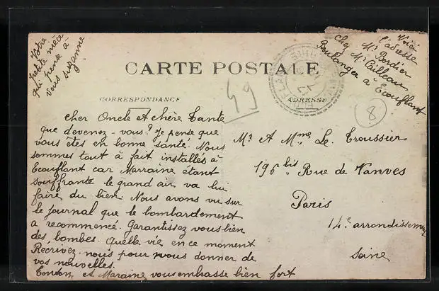 Personenbezogene Daten auf der Rückseite der Karte wurden durch blauen Textmarker unkenntlich gemacht. Die blauen Stellen sind auf die Vorderseite durchgeweicht und wirken sich negativ auf das Postkartenfoto aus