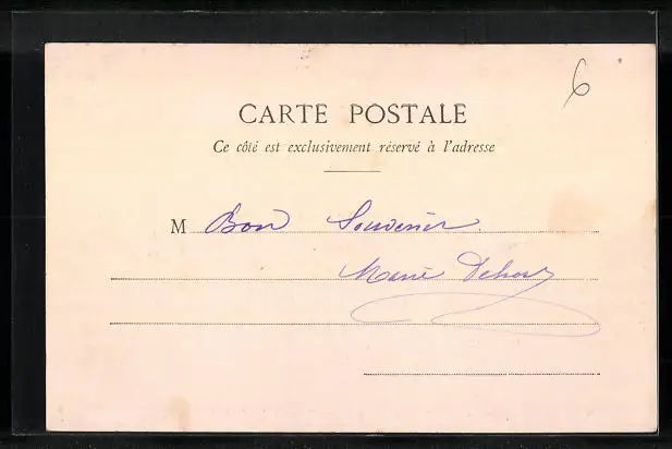 Personenbezogene Daten auf der Rückseite der Karte wurden durch blauen Textmarker unkenntlich gemacht. Die blauen Stellen sind auf die Vorderseite durchgeweicht und wirken sich negativ auf das Postkartenfoto aus
