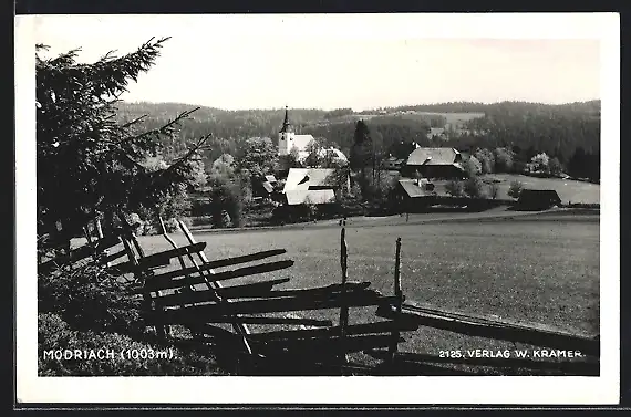 AK Edelschrott, Modriach, Teilansicht mit Feld, Zaun und Tanne