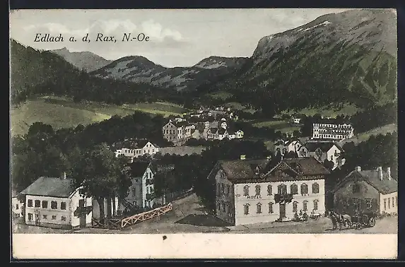 AK Edlach a. d. Rax, Ortsansicht mit Hotel und Bergpanorama, von oben gesehen