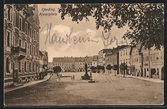 AK Eferding, Hauptplatz mit Geschäften und Denkmal