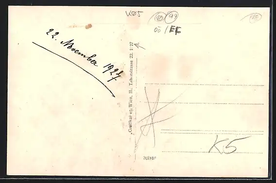 Personenbezogene Daten auf der Rückseite der Karte wurden durch blauen Textmarker unkenntlich gemacht. Die blauen Stellen sind auf die Vorderseite durchgeweicht und wirken sich negativ auf das Postkartenfoto aus