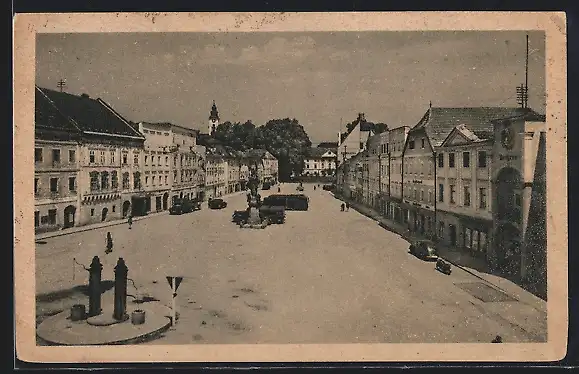 AK Eferding, Platzansicht mit Denkmal, Wasserpumpen, Leute
