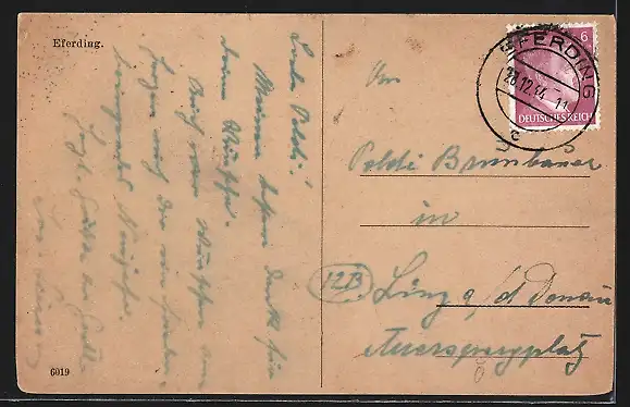 Personenbezogene Daten auf der Rückseite der Karte wurden durch blauen Textmarker unkenntlich gemacht. Die blauen Stellen sind auf die Vorderseite durchgeweicht und wirken sich negativ auf das Postkartenfoto aus