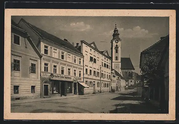 AK Eferding, Strassenpartie zur Kirche, Schuhmacher Gustav Stadelmann