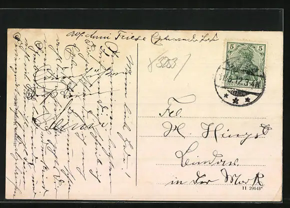 Personenbezogene Daten auf der Rückseite der Karte wurden durch blauen Textmarker unkenntlich gemacht. Die blauen Stellen sind auf die Vorderseite durchgeweicht und wirken sich negativ auf das Postkartenfoto aus