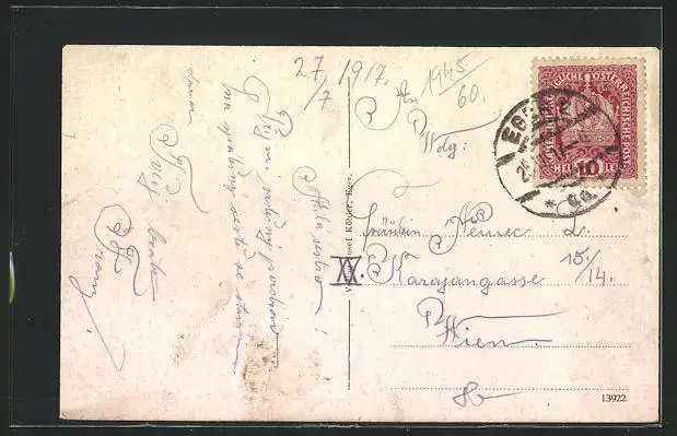 alte Ansichtskarte, gelaufen 1917, Eckknicke li., guter Zustand