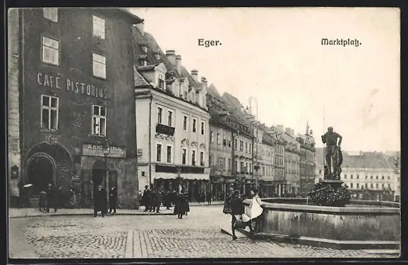 AK Eger, Marktplatz mit Cafe Pistorius, Brunnen
