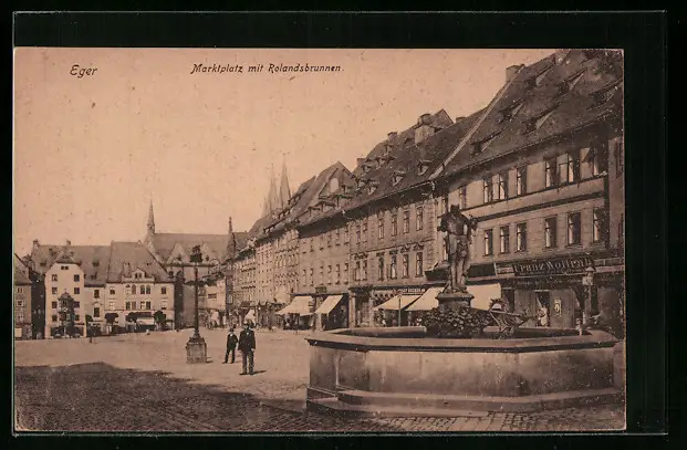 AK Eger, Marktplatz mit Rolandsbrunnen