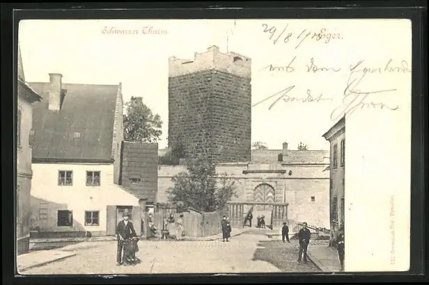 AK Eger, Menschen im Ort mit Schwarzen Turm im Hintergrund