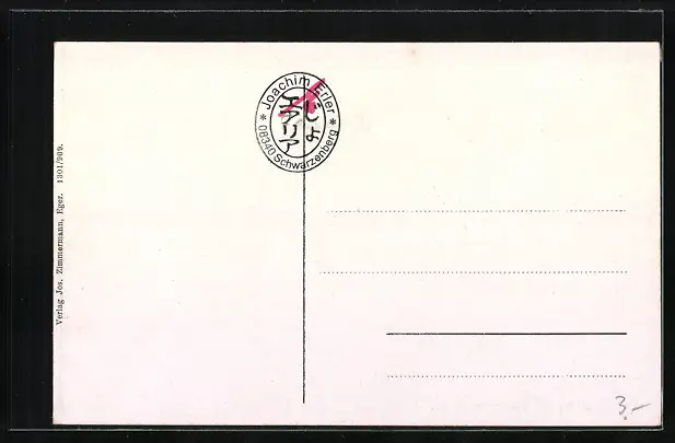 Personenbezogene Daten auf der Rückseite der Karte wurden durch blauen Textmarker unkenntlich gemacht. Die blauen Stellen sind auf die Vorderseite durchgeweicht und wirken sich negativ auf das Postkartenfoto aus