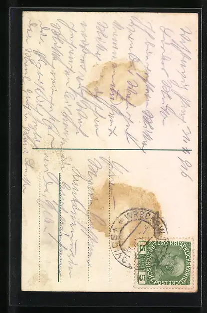 Personenbezogene Daten auf der Rückseite der Karte wurden durch blauen Textmarker unkenntlich gemacht. Die blauen Stellen sind auf die Vorderseite durchgeweicht und wirken sich negativ auf das Postkartenfoto aus