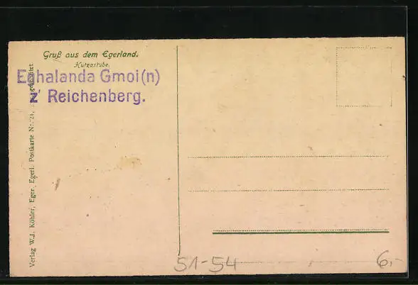 Personenbezogene Daten auf der Rückseite der Karte wurden durch blauen Textmarker unkenntlich gemacht. Die blauen Stellen sind auf die Vorderseite durchgeweicht und wirken sich negativ auf das Postkartenfoto aus