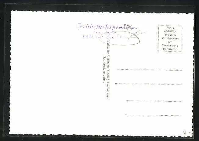 Personenbezogene Daten auf der Rückseite der Karte wurden durch blauen Textmarker unkenntlich gemacht. Die blauen Stellen sind auf die Vorderseite durchgeweicht und wirken sich negativ auf das Postkartenfoto aus