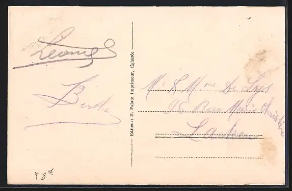 Personenbezogene Daten auf der Rückseite der Karte wurden durch blauen Textmarker unkenntlich gemacht. Die blauen Stellen sind auf die Vorderseite durchgeweicht und wirken sich negativ auf das Postkartenfoto aus