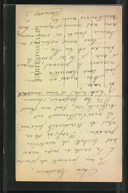 Personenbezogene Daten auf der Rückseite der Karte wurden durch blauen Textmarker unkenntlich gemacht. Die blauen Stellen sind auf die Vorderseite durchgeweicht und wirken sich negativ auf das Postkartenfoto aus