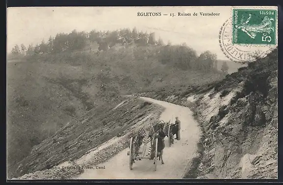 AK Égletons, Ruines de Ventadour et route avec charrette et passants