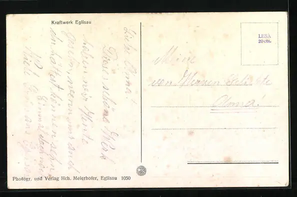 Personenbezogene Daten auf der Rückseite der Karte wurden durch blauen Textmarker unkenntlich gemacht. Die blauen Stellen sind auf die Vorderseite durchgeweicht und wirken sich negativ auf das Postkartenfoto aus