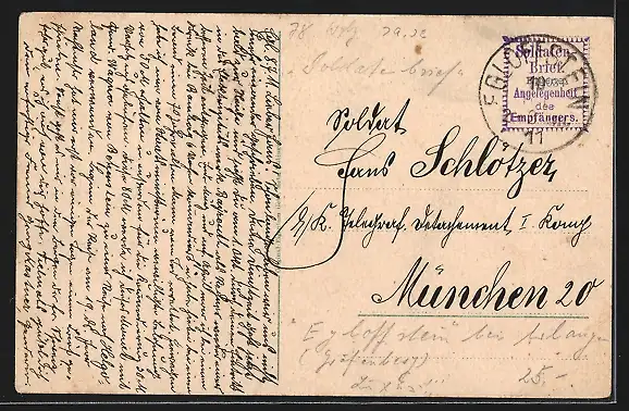 Personenbezogene Daten auf der Rückseite der Karte wurden durch blauen Textmarker unkenntlich gemacht. Die blauen Stellen sind auf die Vorderseite durchgeweicht und wirken sich negativ auf das Postkartenfoto aus