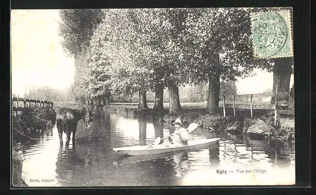 AK Egly, Vue sur l`Orge, Mann im Boot mit seinem Pferd