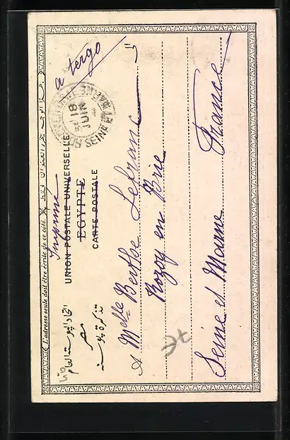 Personenbezogene Daten auf der Rückseite der Karte wurden durch blauen Textmarker unkenntlich gemacht. Die blauen Stellen sind auf die Vorderseite durchgeweicht und wirken sich negativ auf das Postkartenfoto aus