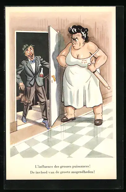AK Ehefrau lauert mit Nudelholz hinter der Tür, frauenfeindlicher Humor