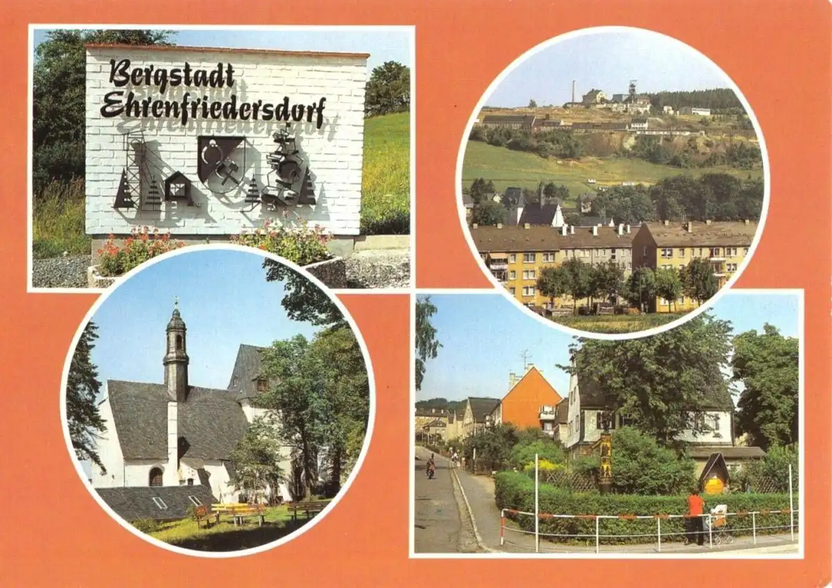 Ansichtskarte Ehrenfriedersdorf vier Abb. - Ortseingang, Blick zum Sauberg, Wehrkirche St. Niklas, An der Karl-Marx-Städter Str. Erhaltung I ungelaufen Druckvermerk: 1985 Herstellungsland: DDR Verlag: Bild und Heimat, Reichenbach i. V. - 01 14 0936/20