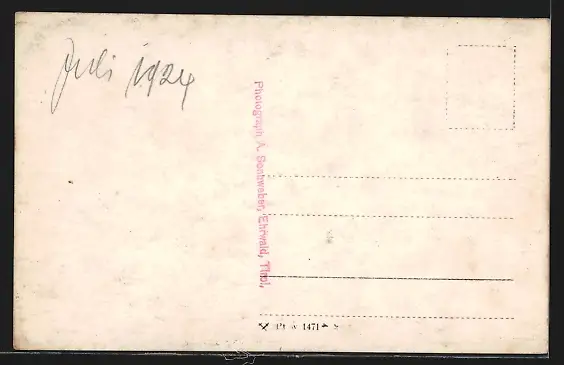 Personenbezogene Daten auf der Rückseite der Karte wurden durch blauen Textmarker unkenntlich gemacht. Die blauen Stellen sind auf die Vorderseite durchgeweicht und wirken sich negativ auf das Postkartenfoto aus