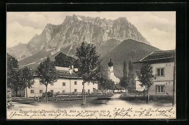 AK Ehrwald, Ortspartie mit Kirche und Blick auf den Wetterstein