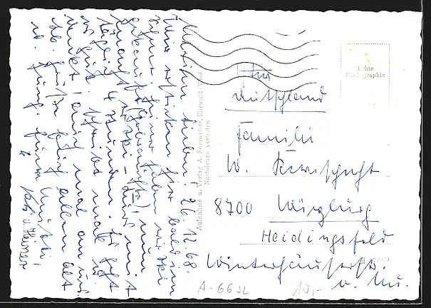Personenbezogene Daten auf der Rückseite der Karte wurden durch blauen Textmarker unkenntlich gemacht. Die blauen Stellen sind auf die Vorderseite durchgeweicht und wirken sich negativ auf das Postkartenfoto aus