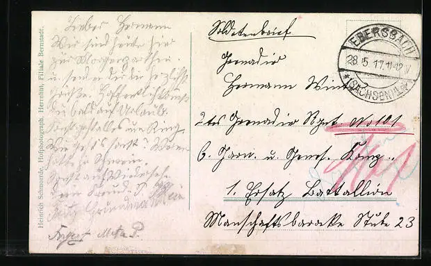 alte Ansichtskarte, gelaufen 1917, rückseitig Oberflächenschaden, guter Zustand