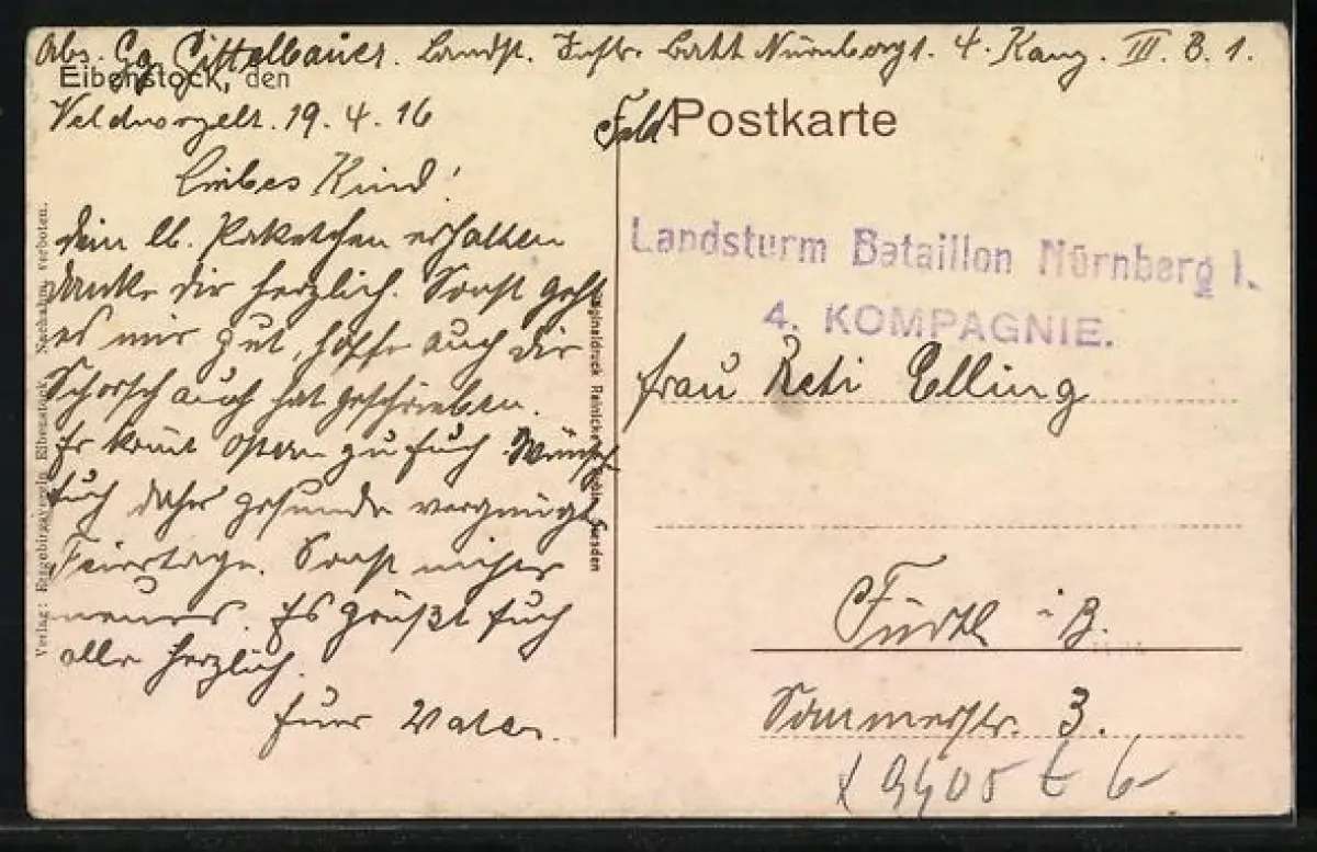 gelaufen 1916, Abriebspur oben rechts, Eckknick oben links, guter Zustand