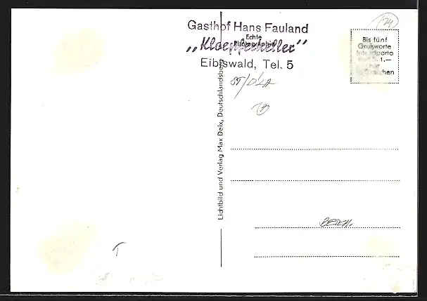 Personenbezogene Daten auf der Rückseite der Karte wurden durch blauen Textmarker unkenntlich gemacht. Die blauen Stellen sind auf die Vorderseite durchgeweicht und wirken sich negativ auf das Postkartenfoto aus