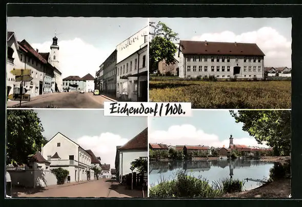 AK Eichendorf /Ndb., Strassenpartie mit Kirche, Ortsansicht hinter Wasser