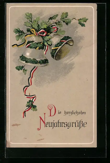 AK Eichenzweig mit Glocken und Fahnenbändern, Neujahrsgruss